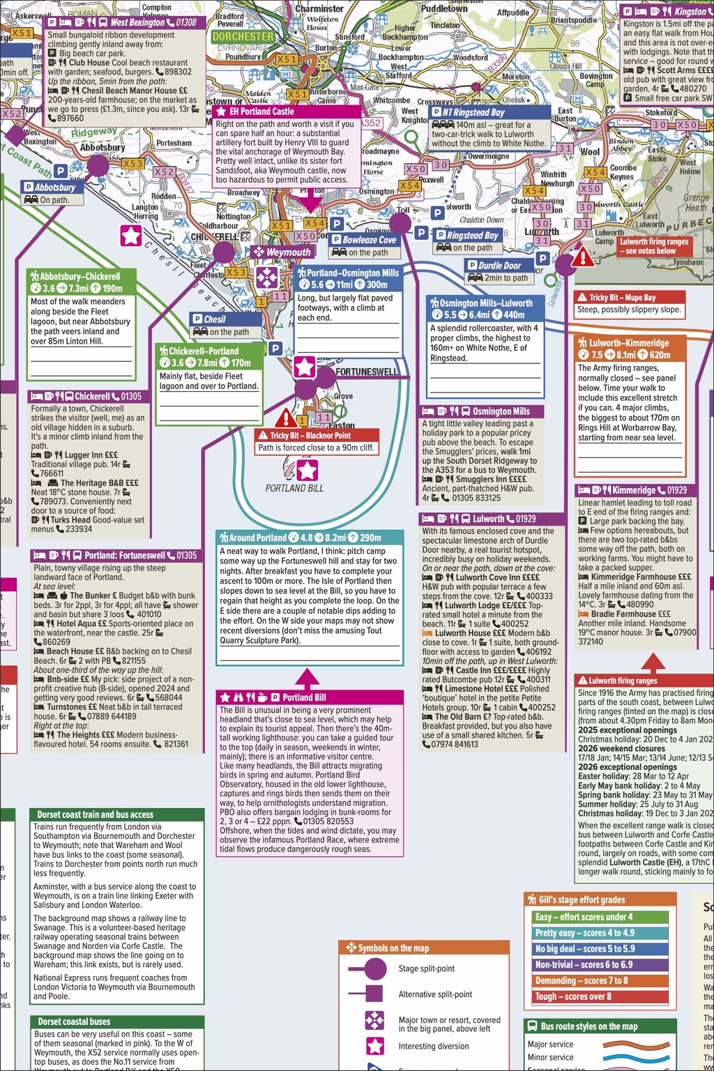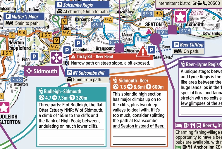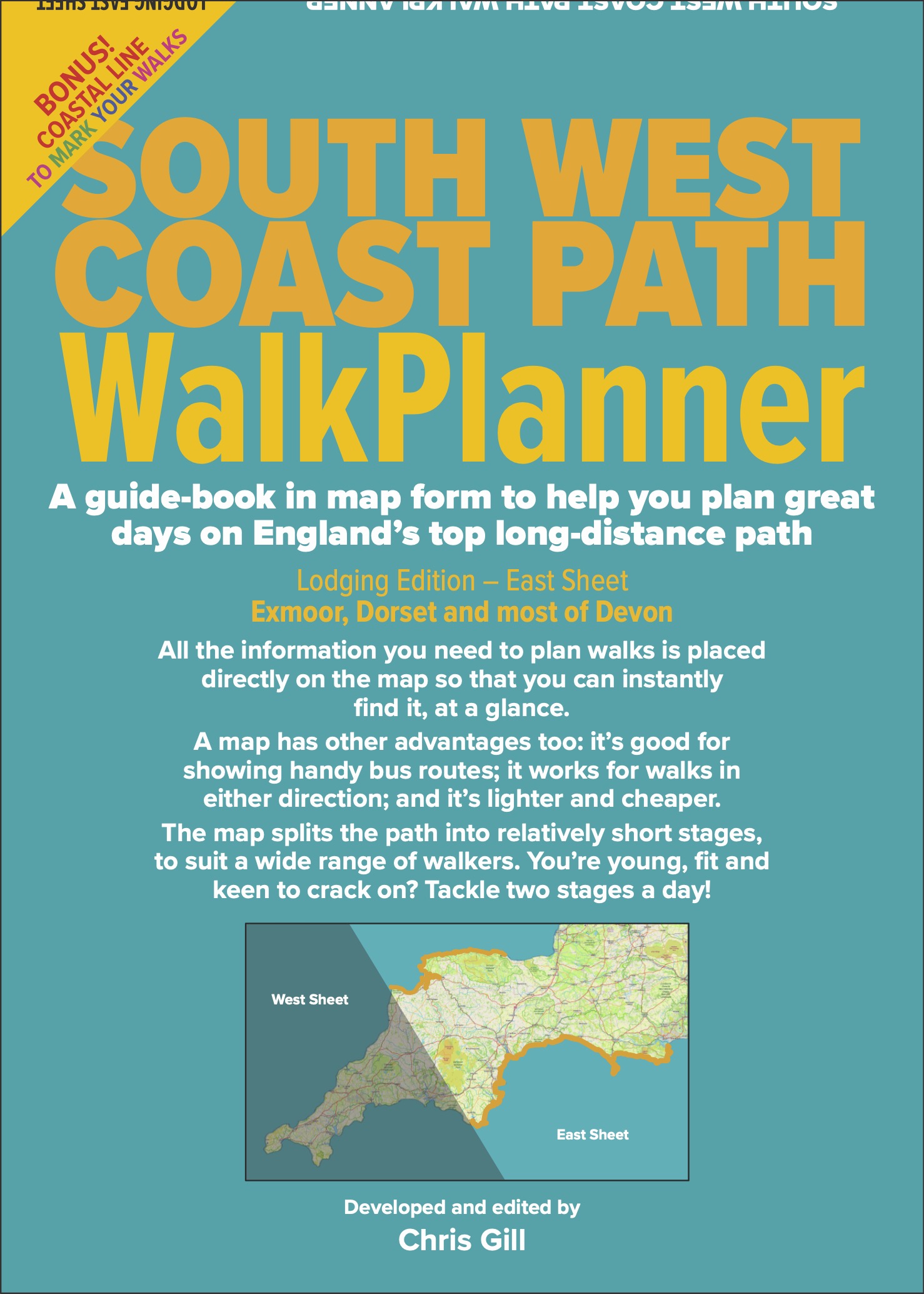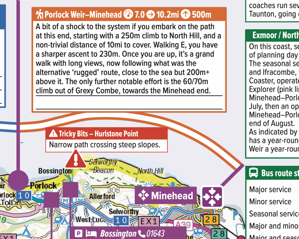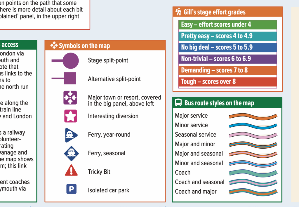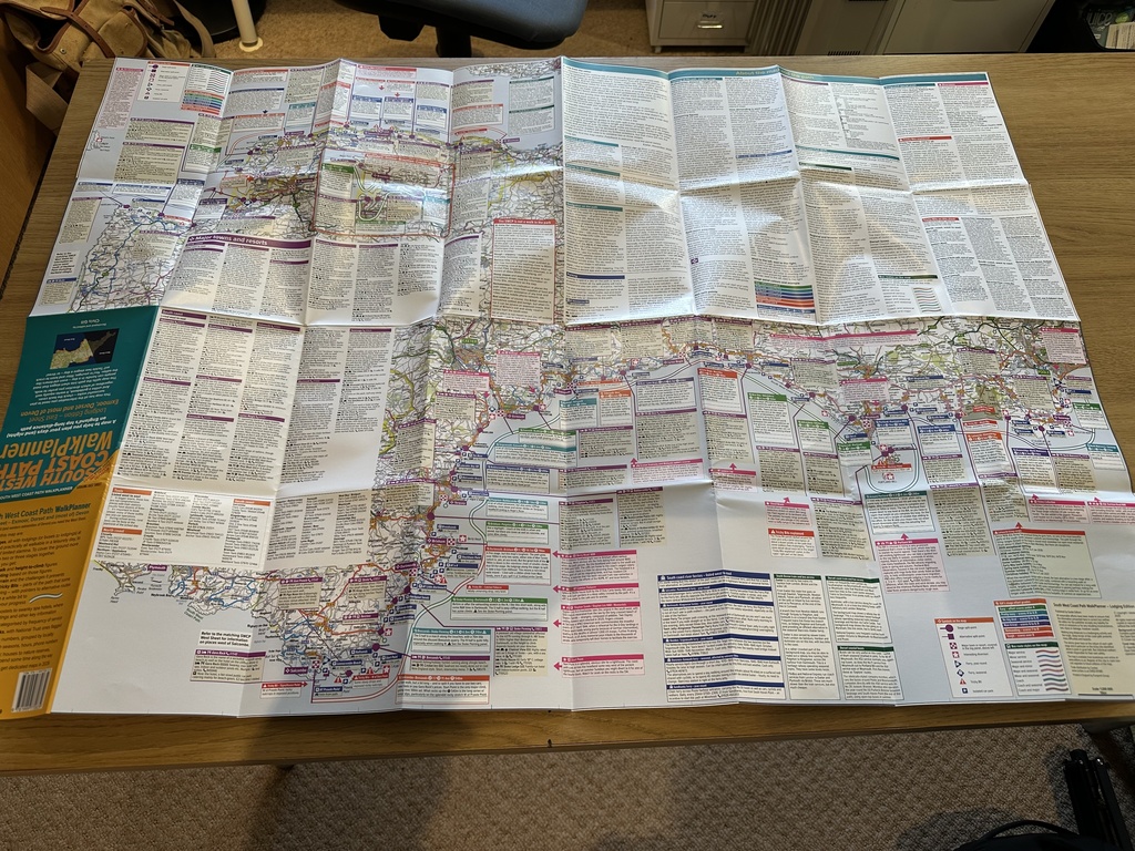 Our first WalkPlanners are guides to England's wonderful 650-miles-long South West Coast Path. The very first, covering the eastern part and focused on overnight stays in lodgings, was published on 1 December 2025. It will be followed early in March 2026 by the matching west sheet, and then in the spring by a whole-path sheet for campers. Here are some images of the SWCP WalkPlanner, Lodging Edition, East Sheet.
